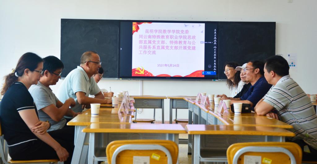 室,与云南特殊教育职业学院党委书记孙继先同志、思政部主任王丽萍同志、特殊教育与公共服务系直属党支部尹文静同志进行座谈交流,孙书记介绍了云南特殊教育职业学院,陈正祥同志介绍了数学学院基本情况和党建工作开展情况,学生一支部书记施菲同志介绍了支部情况,双方就党建工作、党史学习教育情况、支部共建及交流合作进行了深入探讨。
