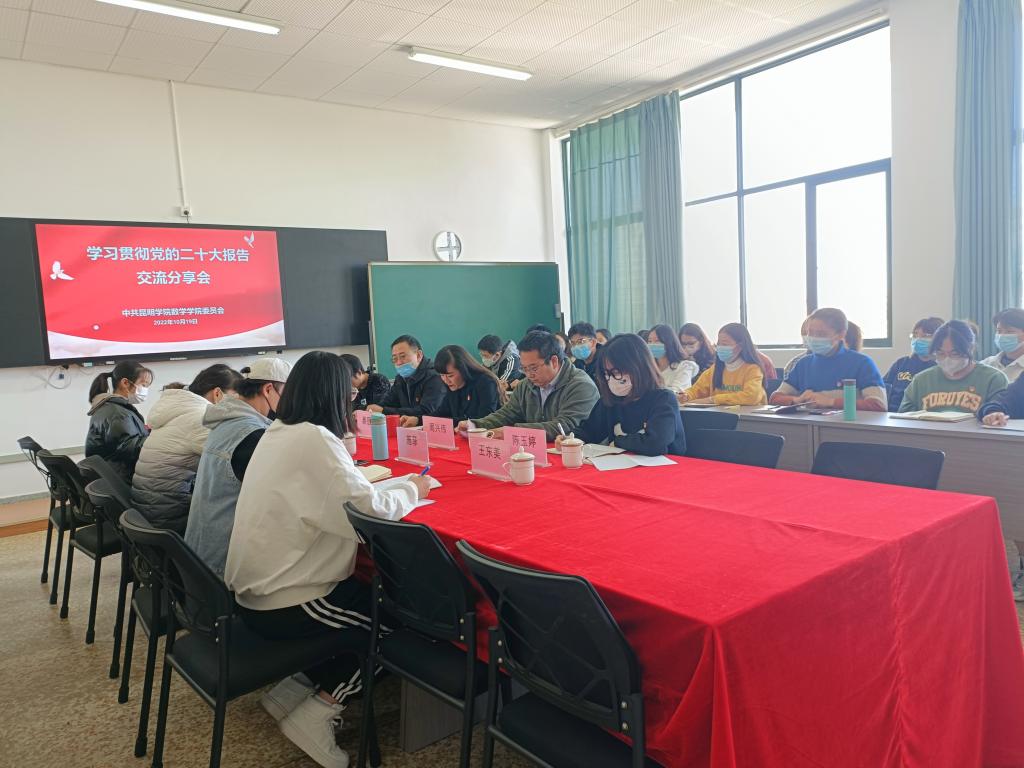 10月19日,数学学院组织召开学习贯彻党的二十大交流分享会,党政领导、师生党员、学生干部及学生代表40余人参加交流分享会,数学学院党委书记秦丽娟同志主持会议。数学学院党委副书记、院长周兴伟同志及党委委员、党政办主任、学生二支部书记周宇同志、学生党员攀打同志、陈玉婷同志、王东美同志、周啟荣同志分别作交流分享发言。
