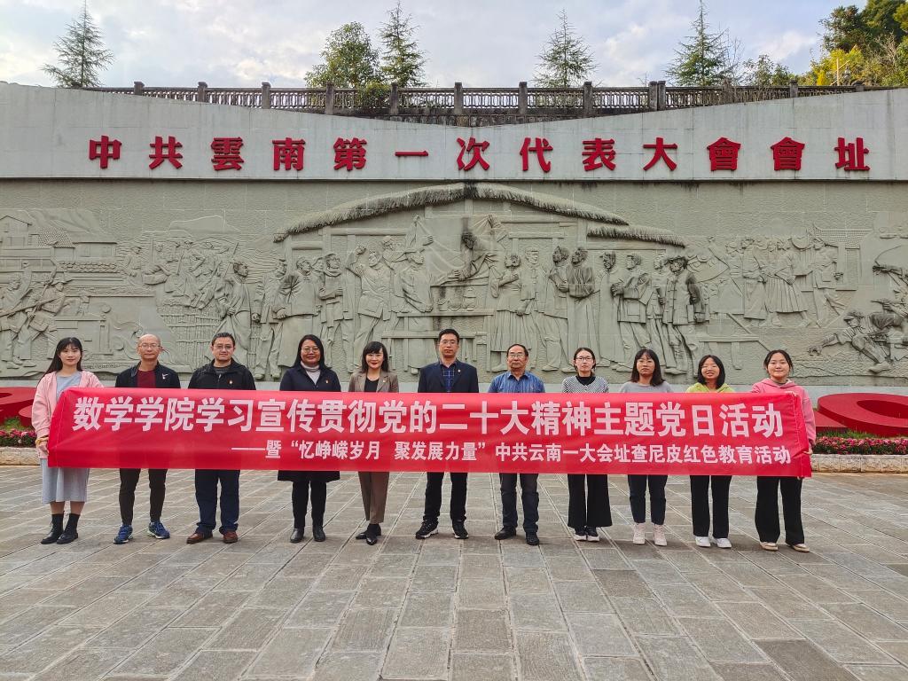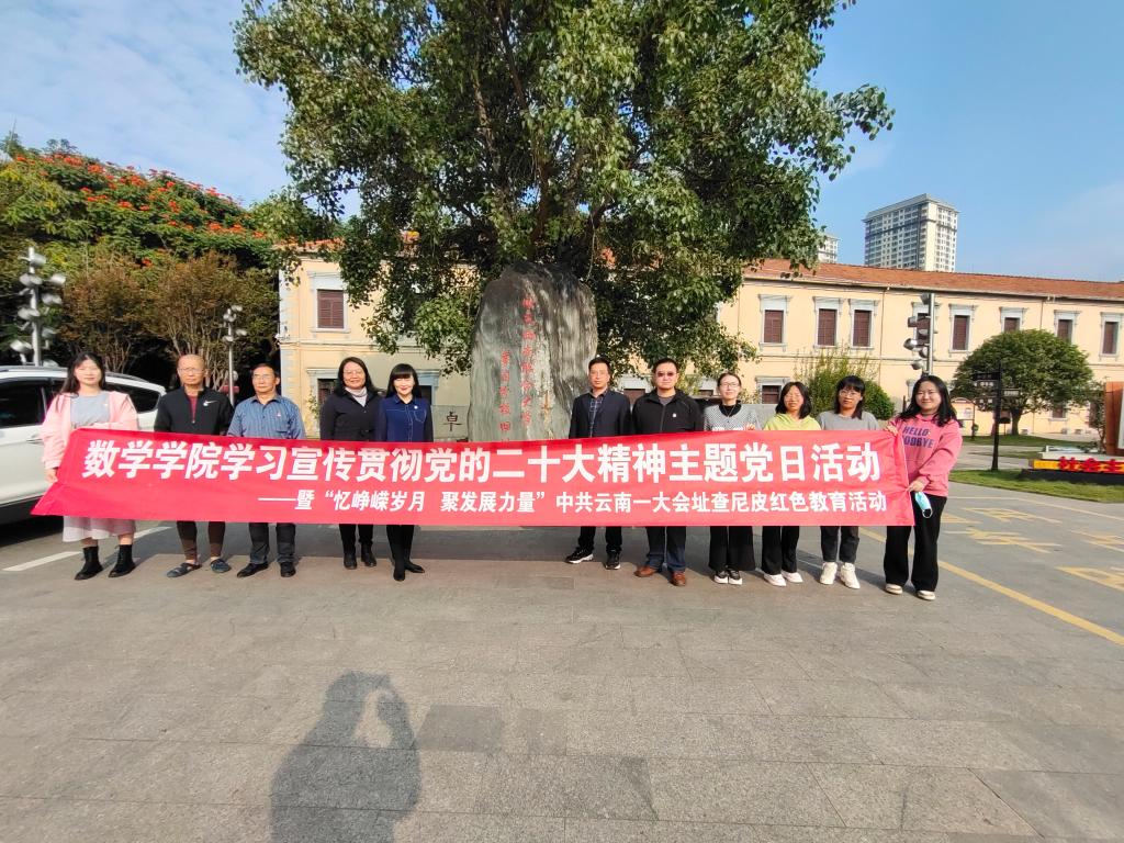 为学习宣传贯彻党的二十大精神,用好红色资源,深化爱国主义,让数学学院党员师生了解云南的革命历史,重温云南革命年代的峥嵘岁月,11月4日至5日,数学学院党委组织部分师生党员前往中共云南省第一次代表大会会址、云南省爱国主义教育基地——蒙自市查尼皮,开展“学习宣传贯彻党的二十大精神”主题党日活动。