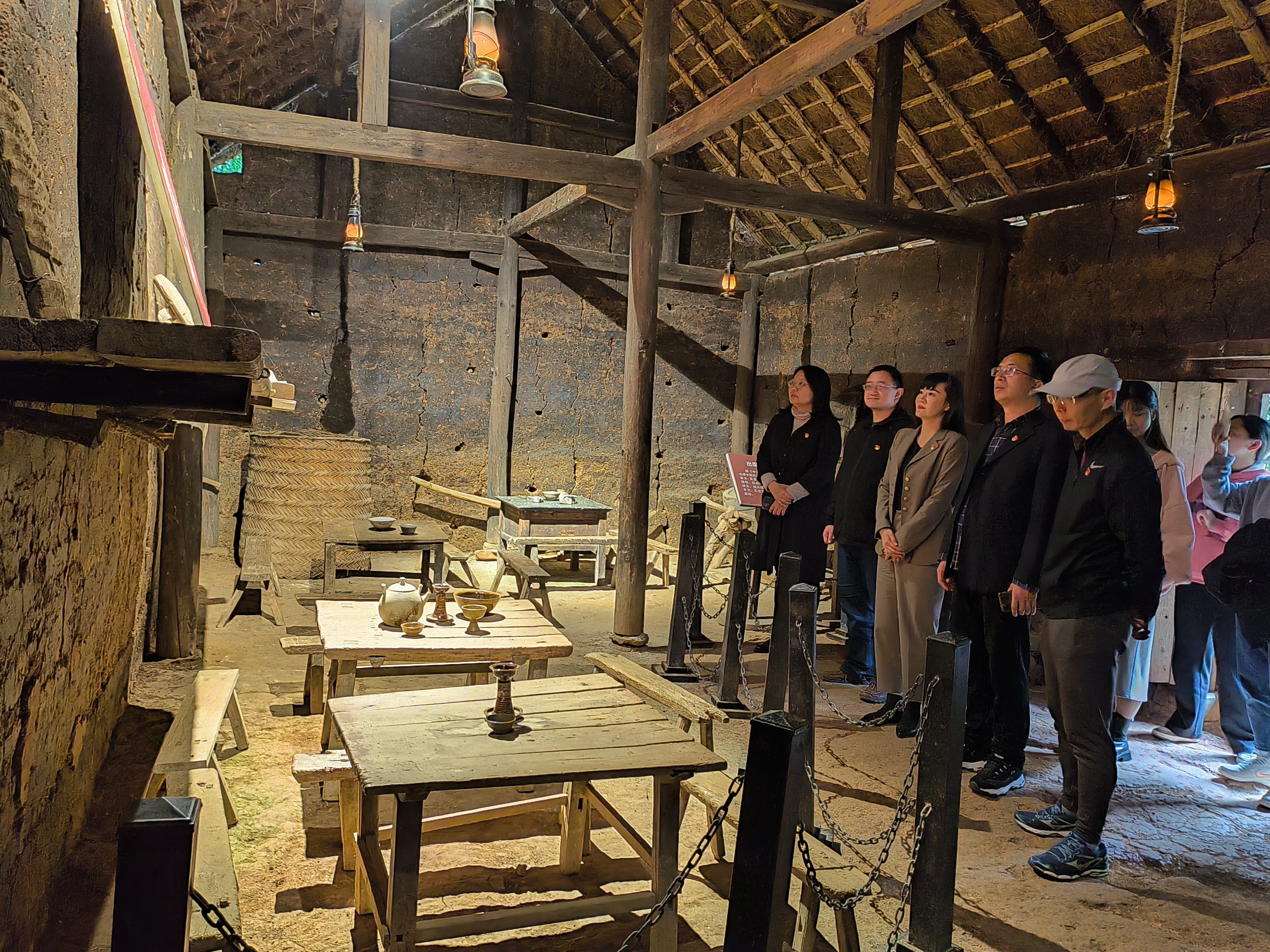 在中共云南一大会址的茅草屋内,两张木桌,几条木板凳,一盏马灯重现了当年的场景,师生瞻仰陈列的先烈照片,了解先烈生平,追寻深山中的“红色印记”。