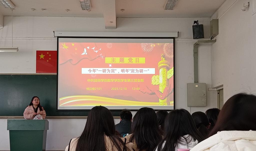为了让支部考研学生党员缓解考前两周紧张、焦虑的情绪,更好地调整考前状态,组织支部研究生分享考前经验、心态调整方法、应试成功经验。数学学院学生第三党支部2023年12月18日中午在博识楼2101教室举办“今年‘一研为定’,明年‘定为研一’”12月考研主题党日活动。