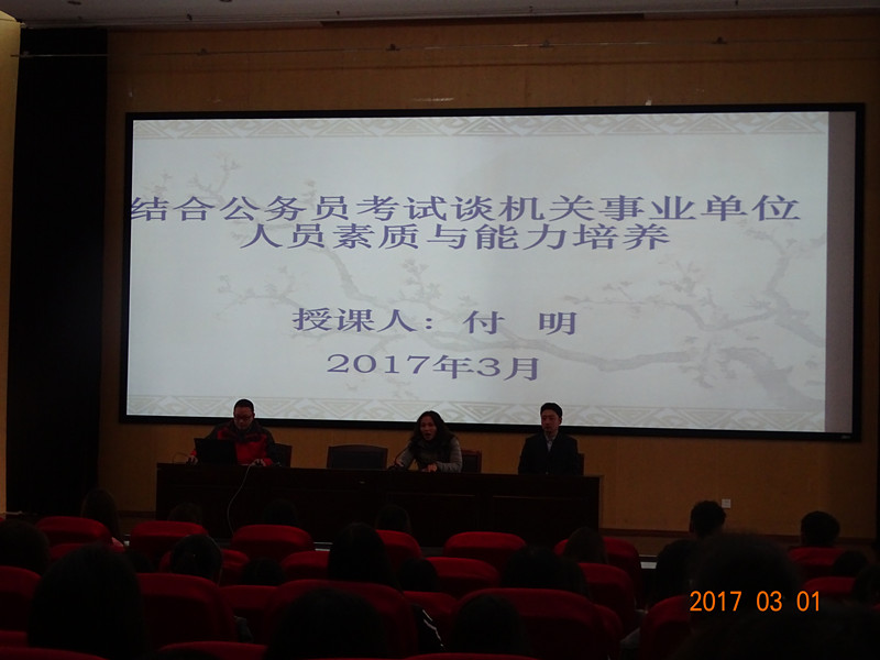 昆明市人力资源和社会保障局政策法规处处长、昆明市法学会理事付明针对就业创业形势与政策的问题作了专题讲座,并就如何应对公务员、事业单位考试及其他各类考试提出了相关建议,阐述了考录招聘的一般原则及公务员、事业单位人员应具备的基本能力,让毕业生认识到当前就业创业形势的严峻性、抓住就业时机及提高自身能力的必要性。下午,学校招就处就业创业指导中心主任叶伟翔老师以“养成教育、诚信教育、职业素养”为主题在博识楼为我系学生开展讲座,强调诚信教育和职业素养的重要性,同时鼓励大家营造和谐关系,不断提升自我修养。