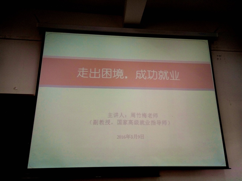 为了帮助2016届毕业生提升就业创业能力,更好的实现就业,数学系于2016年3月9日下午14:00在博识楼2201教室举办了主题为《走出困境,成功就业》的就业创业指导专题讲座,讲座专门邀请了国家高级职业指导师、学校招生就业处副教授周竹梅老师担任主讲。