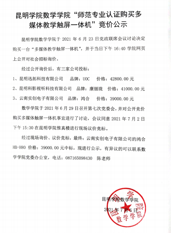 昆明学院数学学院“师范专业认证购买多媒体教学触屏一体机”竞价公示