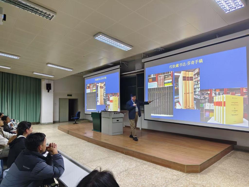 12月8日晚,内蒙古师范大学二级教授、博士生导师、中国数学会数学史分会常务副理事长代钦教授以“达·芬奇的数学世界”主讲昆明学院惟真数学论坛第八讲。代教授从介绍达·芬奇的手稿、笔记和藏书入手,带领与会师生一同走进达·芬奇的数学世界。云南师范大学刘冰楠博士后,字梓洁硕士、费辰宇硕士和昆明学院数学学院姚丽副教授、李川博士后出席讲座,报告会同数学学院院长周兴伟教授主持。